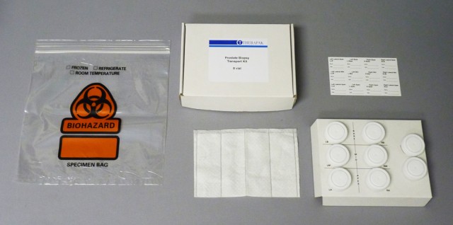 Therapak manufactures five variations of prostate biopsy collection and transport kits. All kits feature standardized components to maximize the ease of collecting and packing specimens for transport. Primary receptacles in the form of 20 mL jars are 95 kPa certified for transport in compliance with DOT and IATA standards for leak resistant transportation.