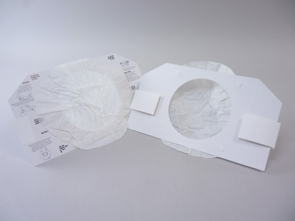 The paper folding collection device consists of a disposable, water-resistant frame which supports an attached tear-away paper collection bowl as well as removable adhesive strips on either side allowing device to be securely anchored to commode. The device is pre-printed with easy to follow instructions, lightweight at only 17.5 grams and ships flat (Product Dimensions: 305 x 170 mm).