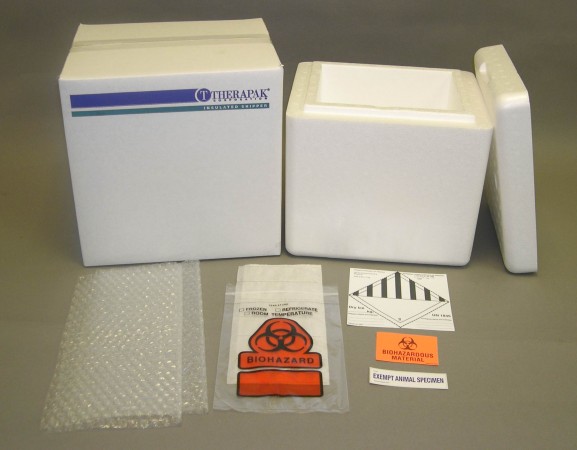 - Includes: specimen bag, absorbent material, Exempt Animal Specimen label, biohazard symbol label, and cushioning material