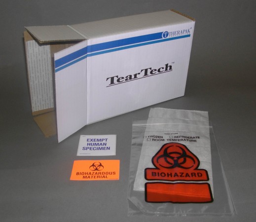 The shipper includes: 50 easy to assemble TearTech® boxes, 100 zip-style biohazard transport bags (two pocket bag for specimen sample and requisition form), 100 Aqui-Pak™ segmented absorbent pouches (each Aqui-Pak™ holds up to 6 standard blood or urine tubes), 50 biohazard labels, 50 Exempt Human Specimen labels, and cushioning material where applicable.