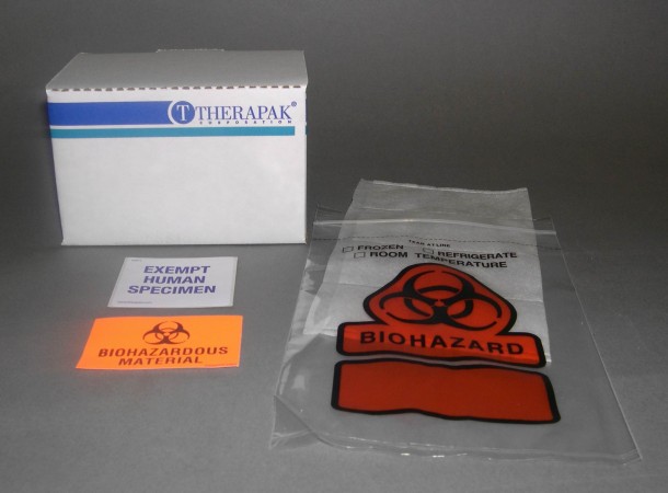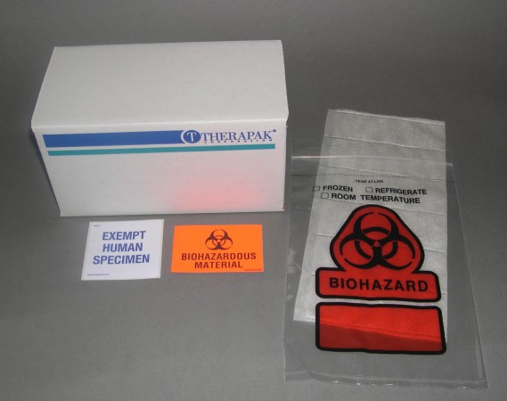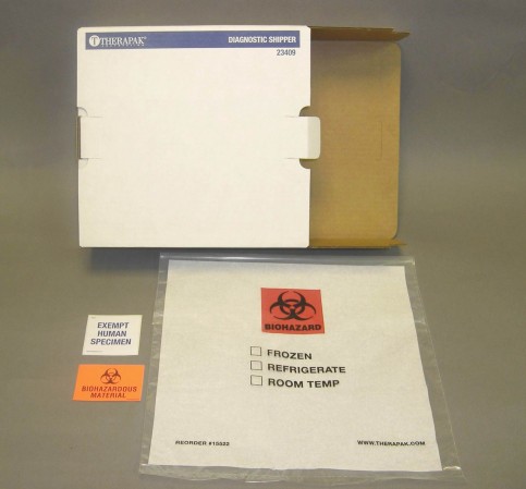 Ambient shipping system features: medium transport box (ID: 7 x 4 x 4″; OD: 8 x 4.25 x 4.25″), specimen transport bag, Aqui-Pak segmented absorbent pouch able to hold up to six standard blood or urine tubes, Exempt Human Specimen label and biohazard symbol label.