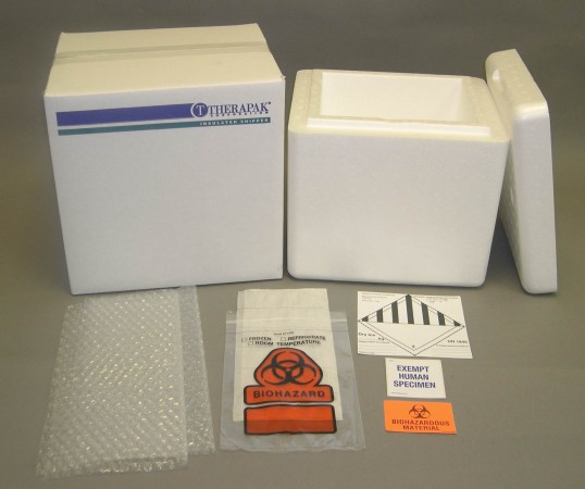 - Includes: specimen bag, absorbent material, Exempt Human Specimen label, biohazard symbol label, and cushioning material