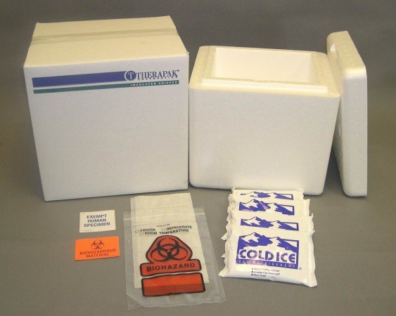 EHS shipping systems for refrigerated specimens feature Therapak’s standard small insulated cooler (ID: 8 x 6 x 8”) and box (OD: 11 x 9 x 11”), which is ideal for overnight shipments via common carriers such as DHL and FedEx. Refrigerated shipping system includes: 8-oz cold packs, specimen bag, absorbent material, Exempt Human Specimen label, biohazard label and cushioning material. Each case includes one set of packing instructions.